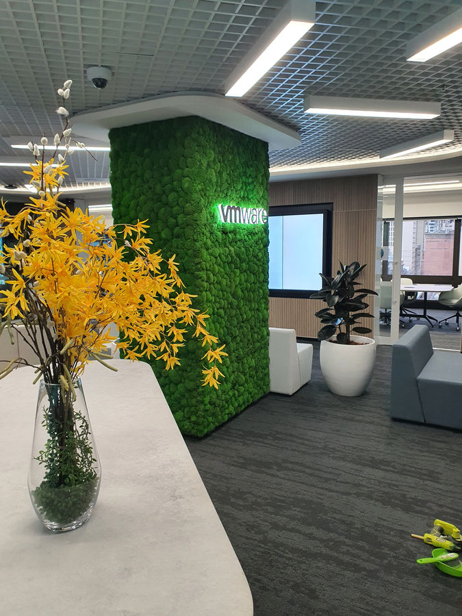 As part of the project, we also created a custom illuminated logo with a sleek silver finish, carefully aligned with VMware’s brand identity. The combination of natural elements and refined branding brings a fresh contrast to the contemporary setting, making this installation both functional and visually engaging.